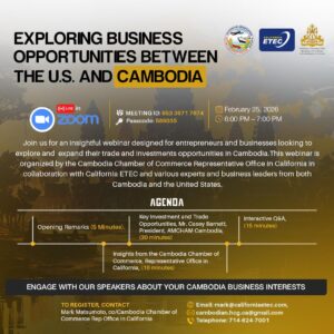 Join an informative Zoom webinar exploring trade and investment opportunities between the United States and Cambodia. Industry experts and business leaders will share insights, followed by an interactive Q&A session.